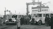 Les bus de la Croix Rouge suédoise dans le port de Korsør, 1945. Ils emmenaient en Suède des détenus libérés des camps de concentration.